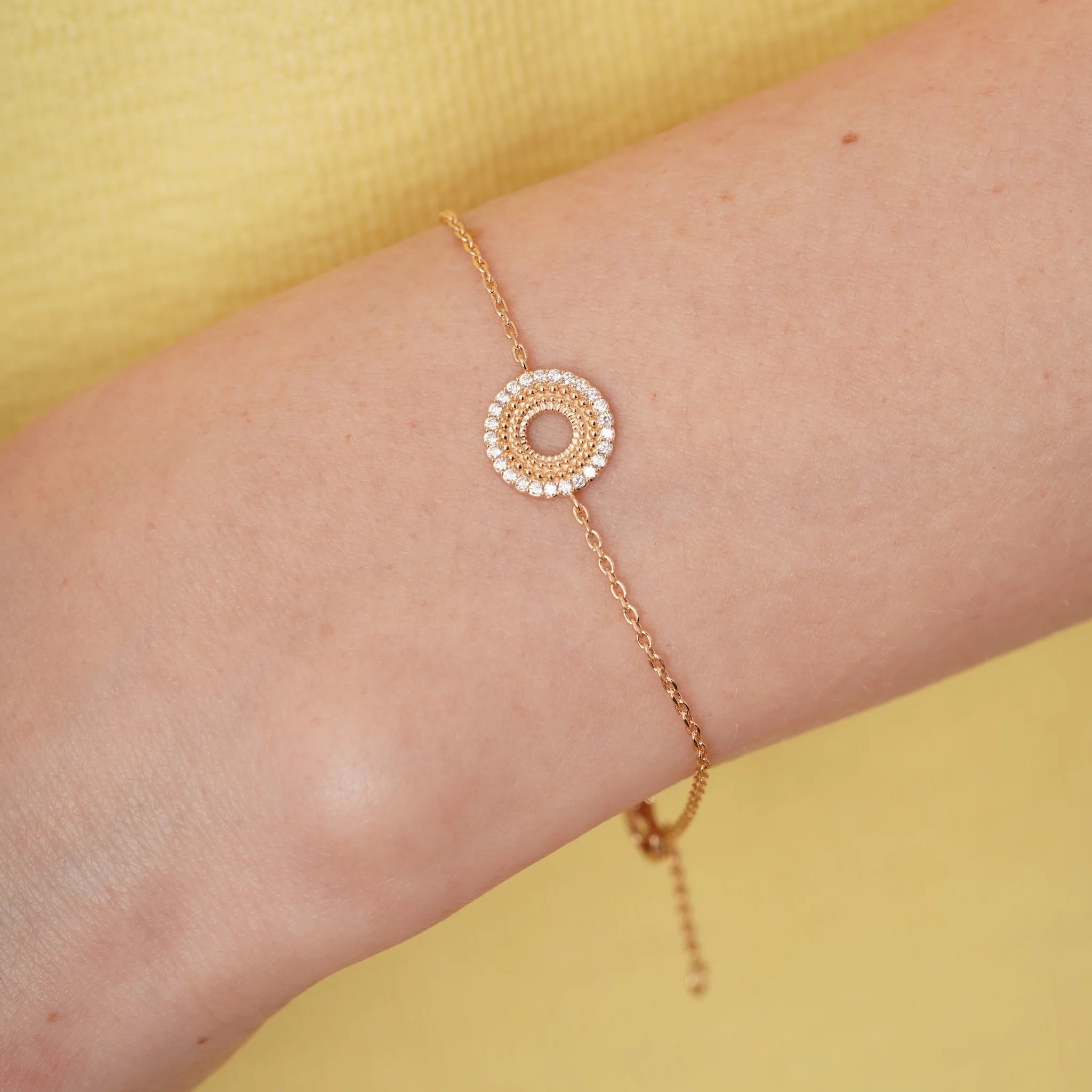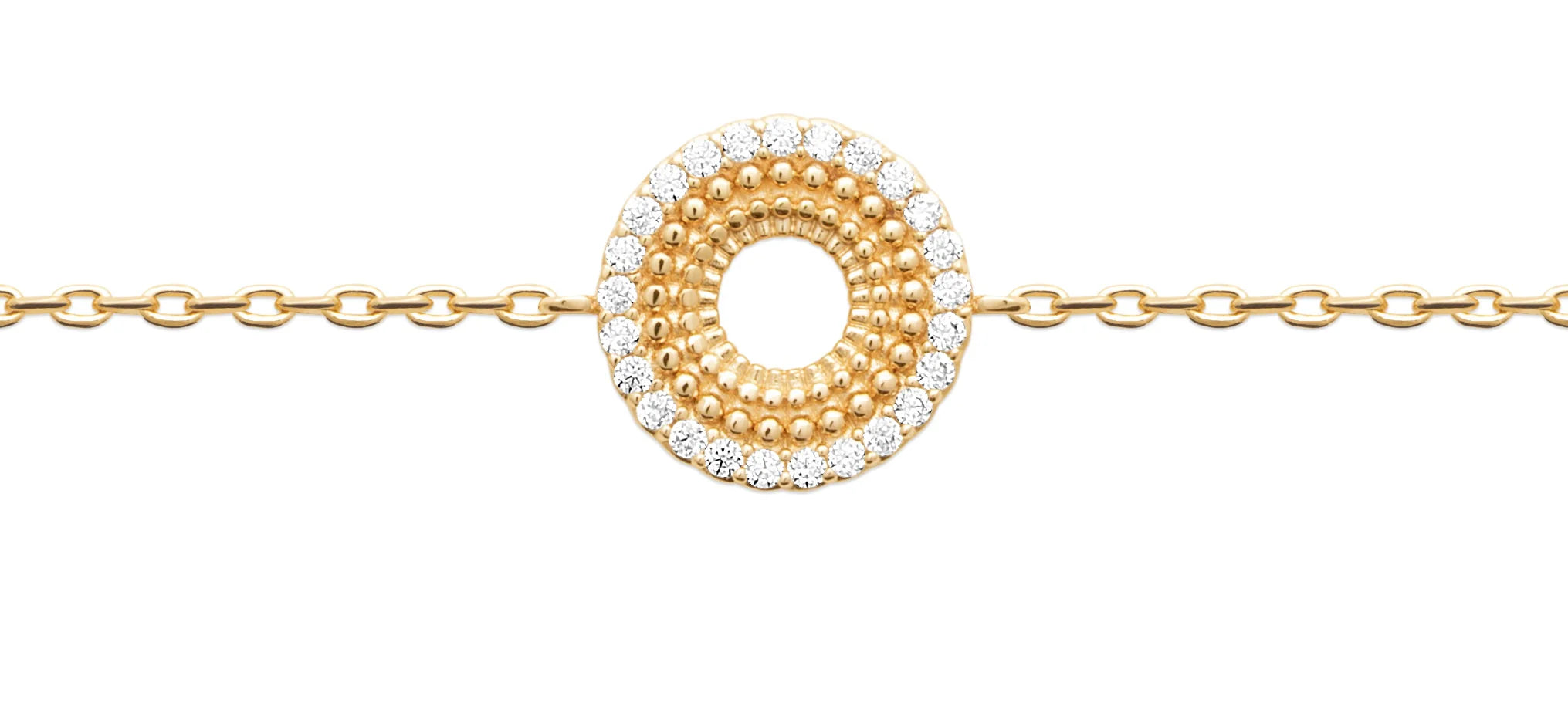 This chain bracelet features a simple yet elegant design, with a circular pendant that adds a focal point of sparkle. The pendant is framed by a delicate outline of cubic zirconia's, each one carefully set to catch the light and add a refined touch of glamour. The bracelet’s fine chain complements the pendant perfectly, creating a balanced, timeless piece that can be worn alone for a subtle, chic look or layered with other bracelets for a more personalized style. Its classic design makes it a versatile accessory, effortlessly elevating both everyday outfits and evening ensembles.
