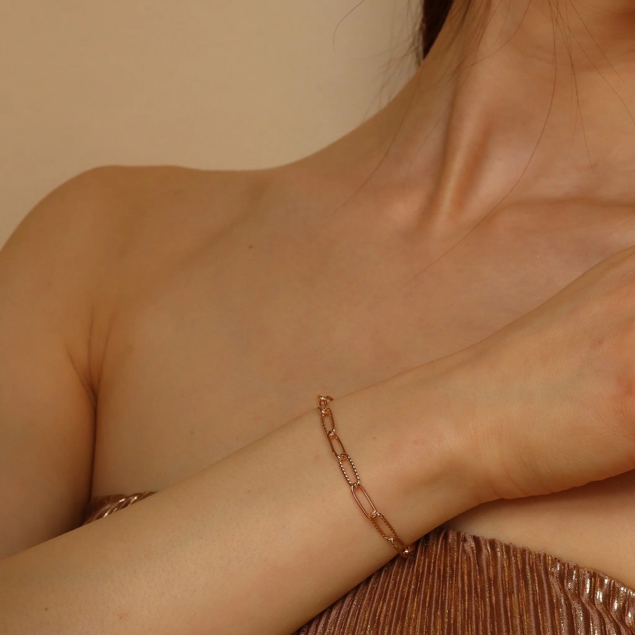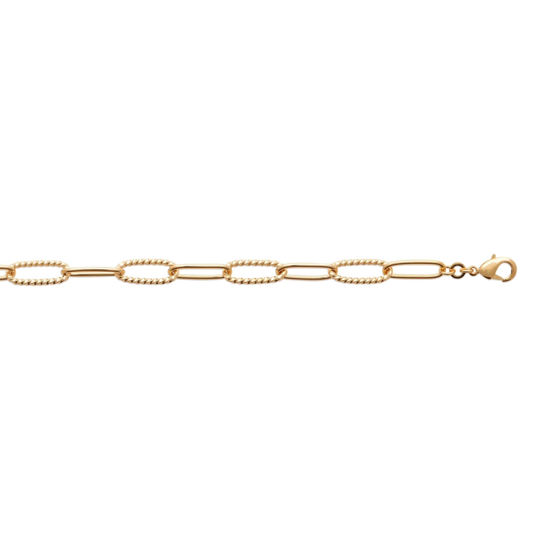 Dance along the midnight street, showing just how free you are. This 18k gold plated chain bracelet is light gentle adornment on your wrist. With intermittent twisted rope design chain links, this bracelet has that little bit of gentle love everyone is looking for.