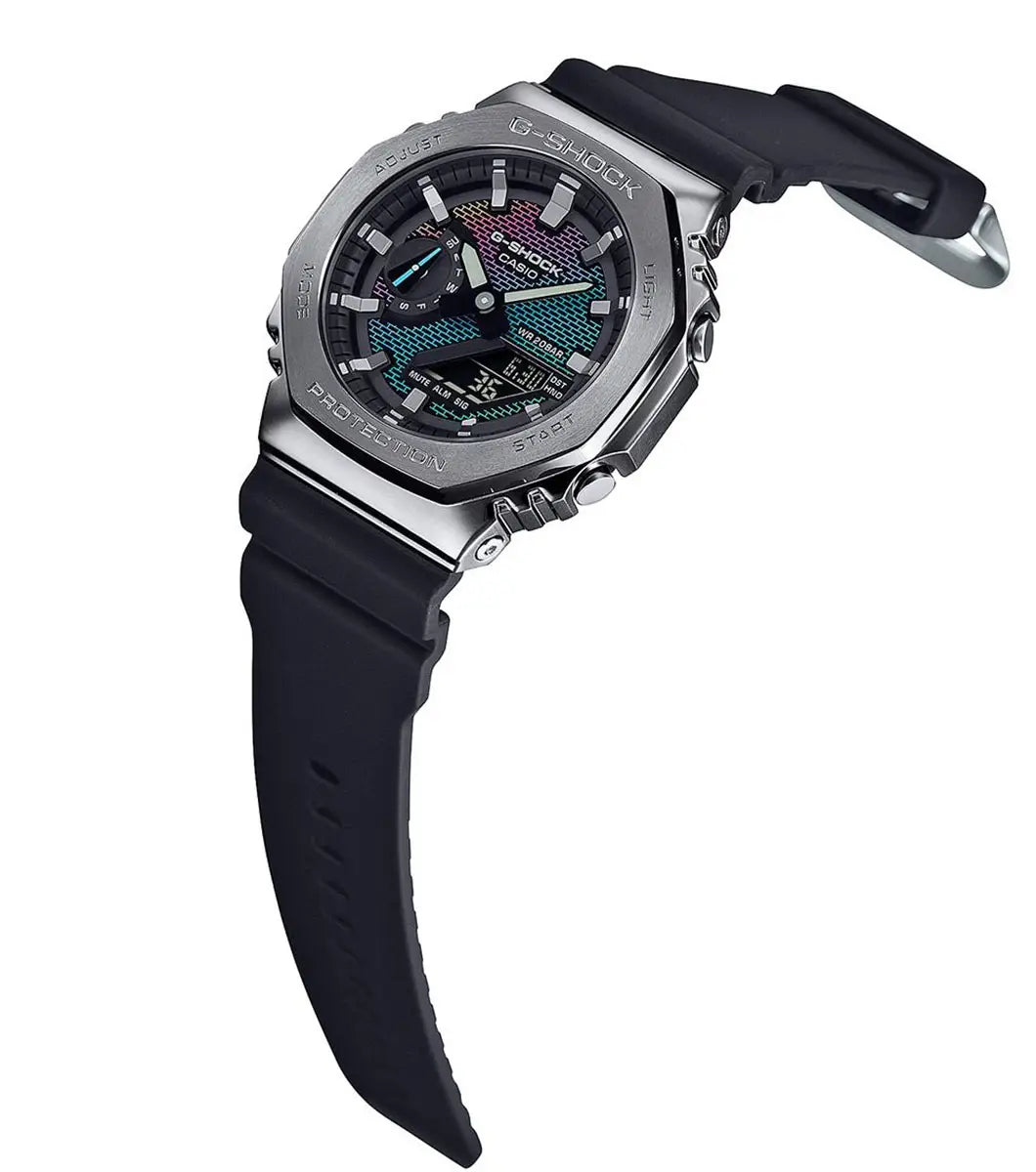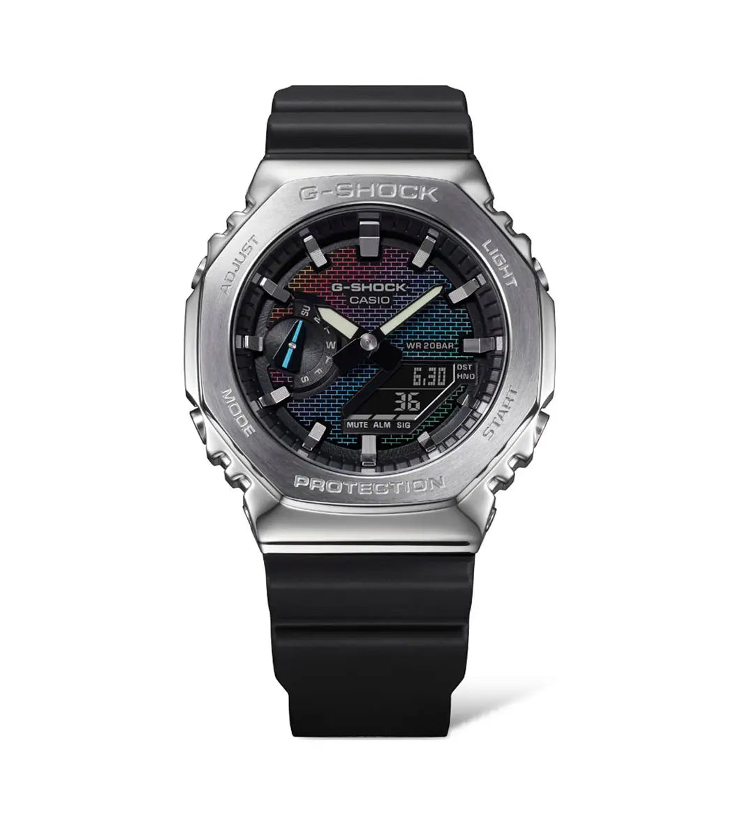 The bold GM-2100 gets a multi-tone makeover with our new rainbow brick wall series featuring a silver bezel.