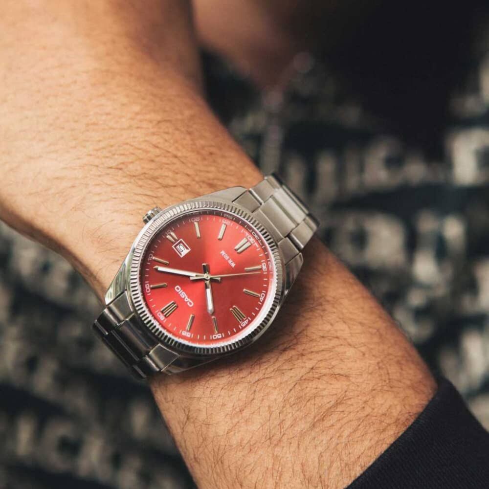 A smart style with a colourful injection, this Casio Classic watch is a stylish choice for any occasion. Designed with reliable quartz movement, this watch features a deep red dial with a three-link stainless steel bracelet strap, and baton markers. This watch also features a date display window, Neobrite hands perfect for checking the time in the dark. This watch would make the perfect gift for a stylish man in your life.