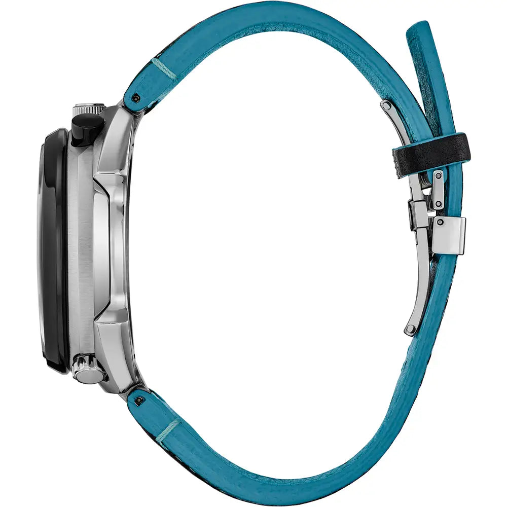 The Limited Edition Promaster Bullhead Racing Chronograph is the latest addition to our Promaster collection, in a striking design inspired by Citizen’s racing roots. The distinctive chronograph features a unique light blue dial with red accents on a silver-tone stainless steel case. It has a hand-assembled movement and advanced features that have been updated to reflect a racing aesthetic, including a power reserve indicator resembling a fuel gauge, and the 60-minute chrono dial designed to look like a speedometer. The perforated black leather strap further emphasises Citizen's racing roots. Other features include a tachymeter, an alarm, and a flat sapphire crystal. Like other watches in the Promaster collection, it is water resistant up to 200 metres, and sustainably powered by any light with our Eco-Drive technology that never needs a battery. This collector’s watch comes in a special edition box with plaque. Limited to 4,973 unnumbered pieces worldwide.