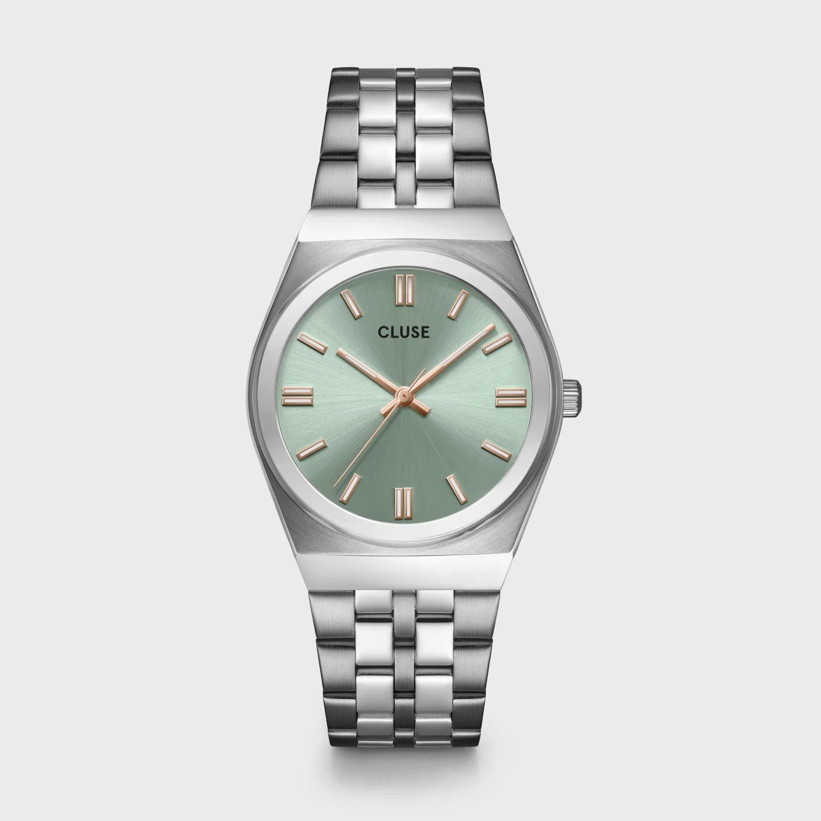 The round Retro 70's watch for women features a 33 mm silver coloured case, sage green vintage looking dial with rose gold hands and silver coloured 20 mm 5-link stainless steel strap.