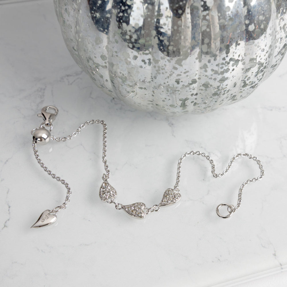 Delicately radiant, the Desire Cherish Precious Pavé Heart Slider Bracelet features three adjoining mini hearts at its centre, each set with sparkling Semi-Precious White Topaz for a touch of brilliance. Crafted in Sterling Silver with a smooth slide , it adjusts up to 7" for a perfect, comfortable fit—elegant, heartfelt, and effortlessly wearable.