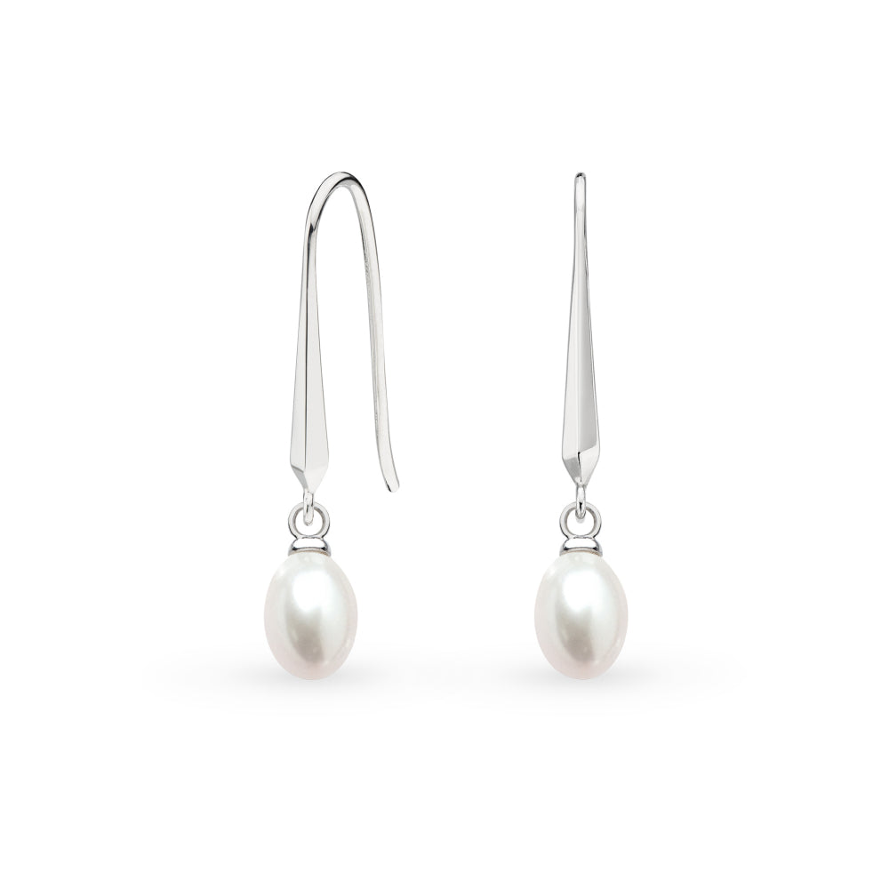 Styled to outright sophistication, freshwater pearls never looked so alluring! Made into these stylised pillar-esque drop earrings with long and sleek hook wires in our edged Revival style, each silver drop earring is perfectly complete with a softly feminine pearl drop.