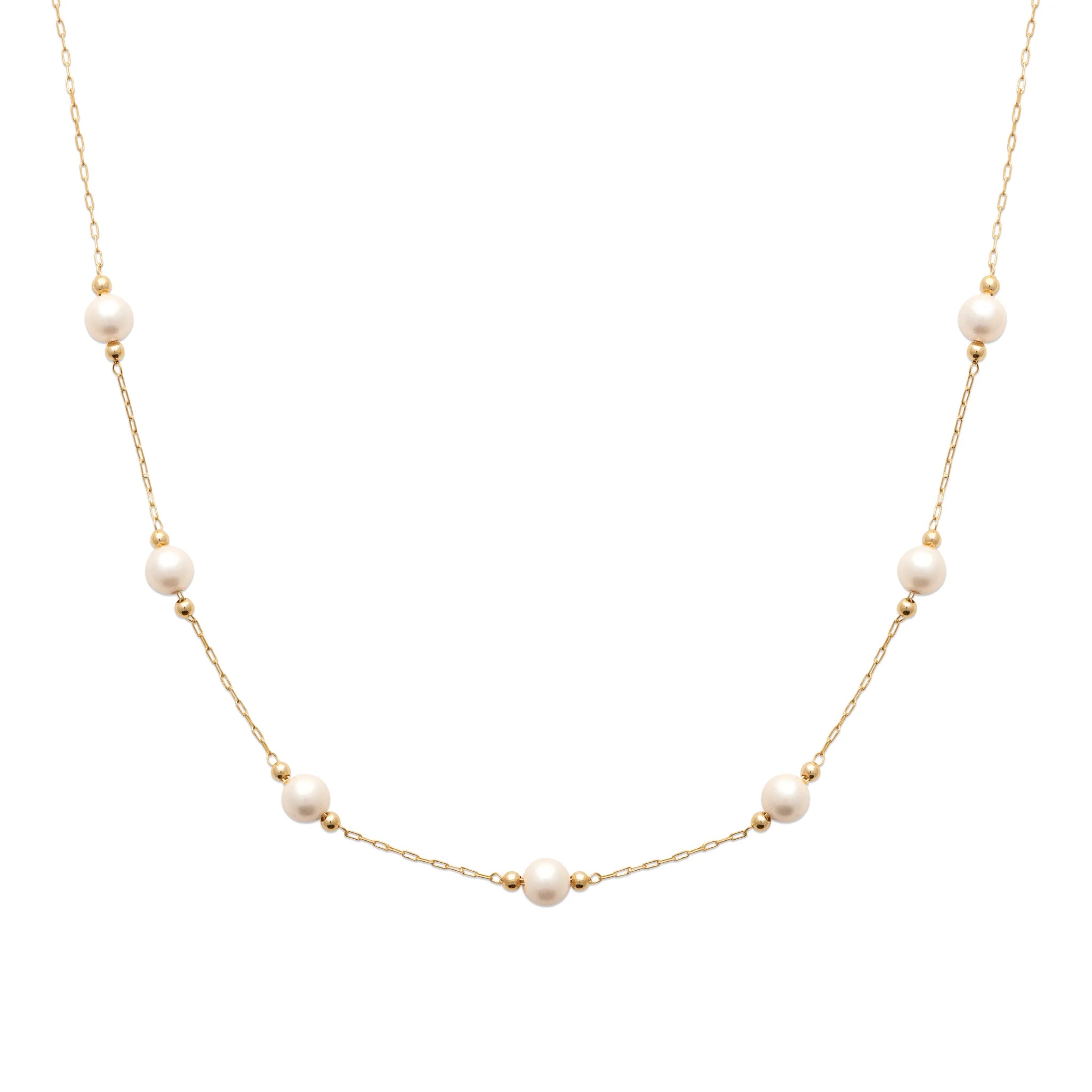 Be the one who dedicates themselves to what they love. Friends, family or lifestyle. Give it your best shot. This 18k gold plated necklace features intermittently placed simulated pearls held in place by small baubles on each side. A sweet gift for anyone, the necklace is great for those important events in life. Prefer a bracelet of the same style? We have that available too.