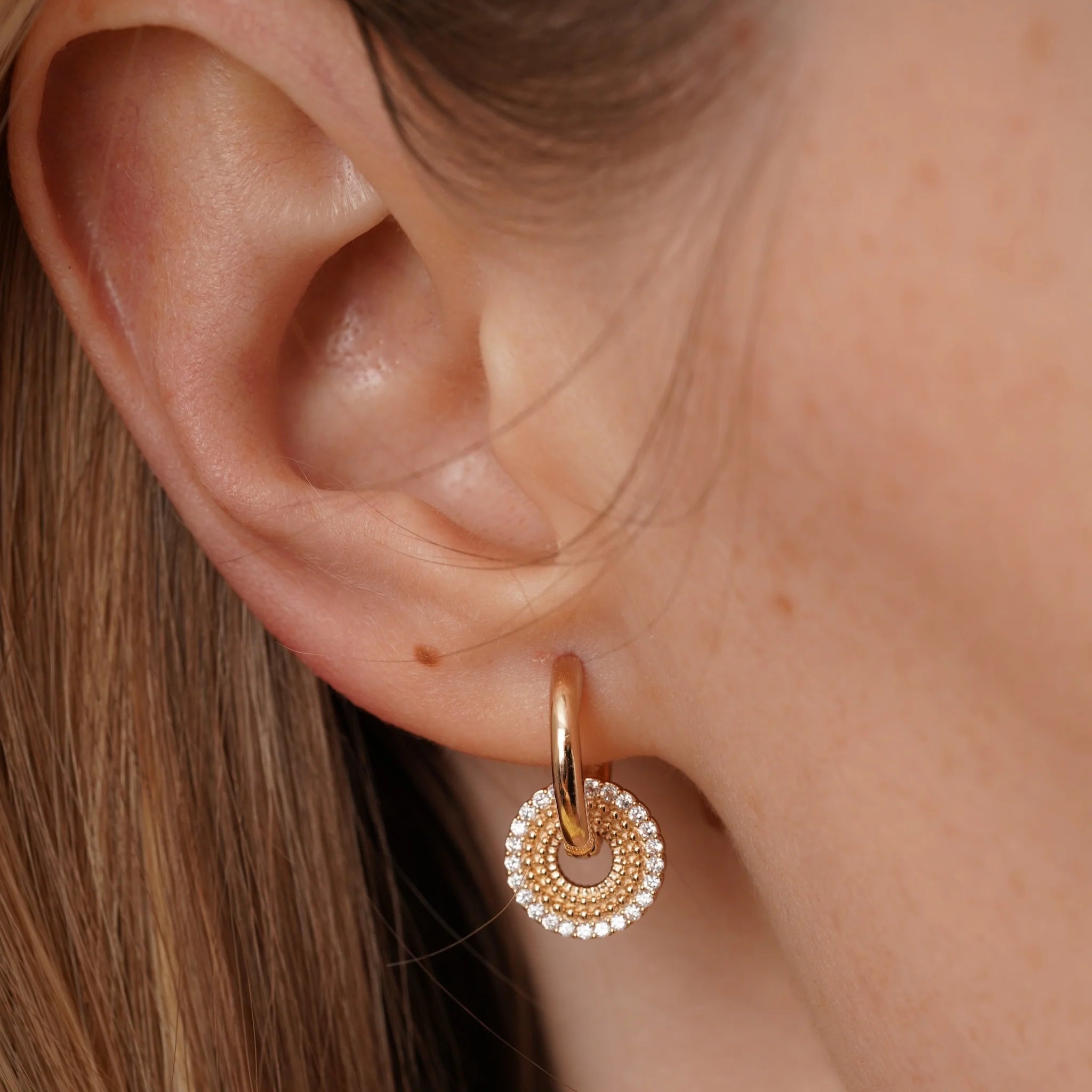 These earrings feature a simple yet elegant design, with a circular shape that adds a focal point of sparkle. The circle is framed by a delicate outline of cubic zirconia's, each one carefully set to catch the light and add a refined touch of glamour. This piece creates a balanced, timeless piece that can be worn alone for a subtle, chic look. Its classic design makes it a versatile accessory, effortlessly elevating both everyday outfits and evening ensembles.