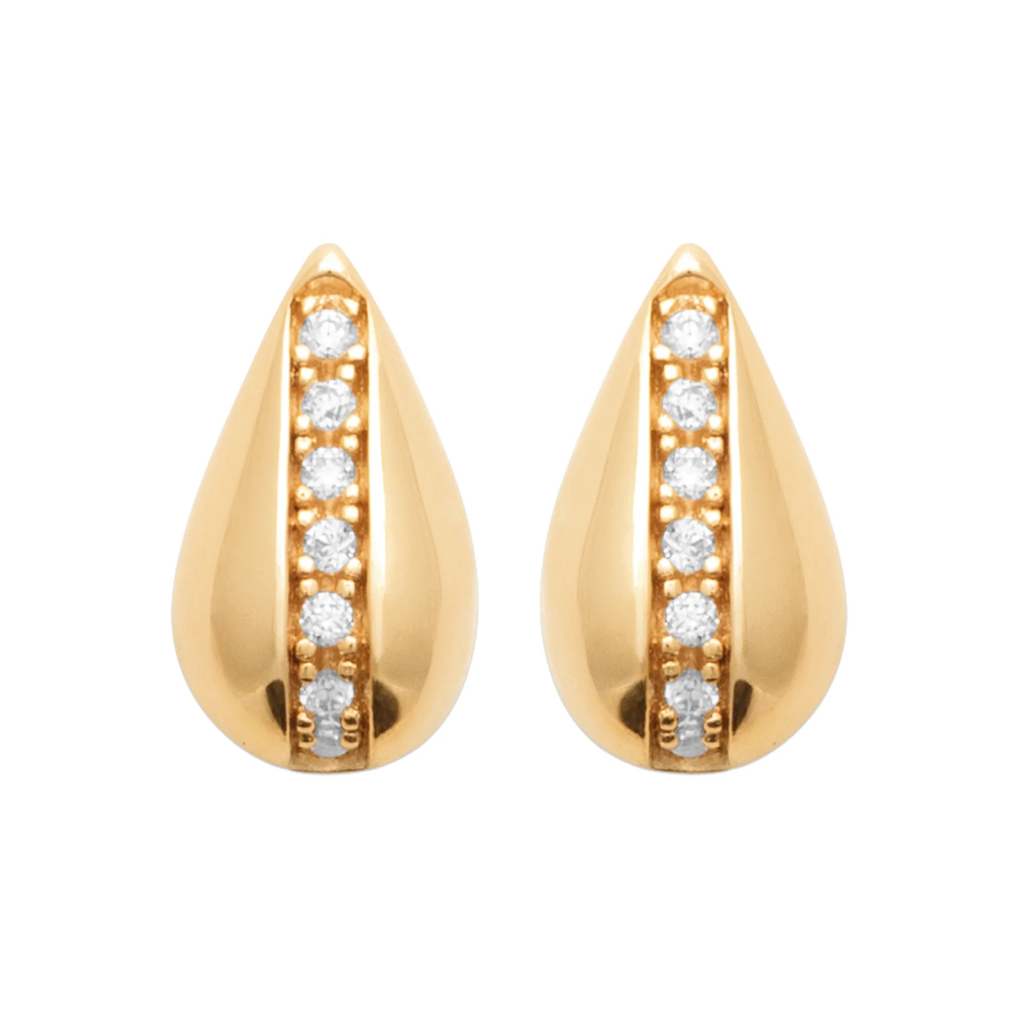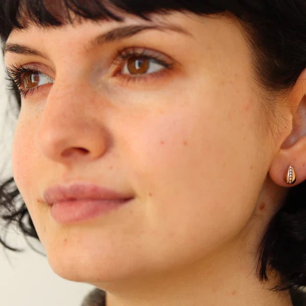 Elevate your style with our Snowdrop small stud earring, featuring a dainty small dome with cubic zirconias set in 18k gold plate. Embrace timeless elegance with this classic fashion pair of studs that adds a touch of cuteness and sweetness to any outfit. Sparkle with sophistication and stand out in the crowd.